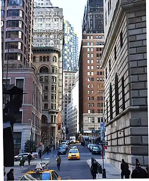 William Street is a street in the Financial District of Lower Manhattan, New York City. It runs generally southwest to northeast, crossing Wall Street and terminating at Broad Street and Spruce Street, respectively. Between Beaver Street and Broad Street, the street is known as South William Street. Between Beekman Street and Spruce Street, in front of New York Downtown Hospital, William Street is a pedestrian-only street.