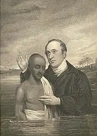 "William Ward baptizing a Hindoo in the Ganges at Serampore", print (1821) from a painting by John Jackson