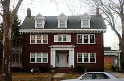 Completed in 1917, this 2½-story, brick Georgian Revival structure was built by local contractor John Henry Cail. The house features a side gable roof with flanking chimneys and three gable dormers, a symmetrical facade, and a two-story solarium. A detached two-car car garage, built in 1926, sits behind the house. Located in the Wellington Heights neighborhood of Cedar Rapids, it is similar in size and construction to the other houses in this residential area.[2]