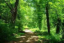 Natural areas include forested portions, wetlands, and a community garden.[1] A portion of the park on the northern edge is forested and nicknamed as Owl Woods due to the presence of a great horned owl.[32] Other birds that inhabit the park include wrens, pileated woodpeckers, grosbeaks, red-tailed hawks, and bald eagles on occasion.[32] The park includes the Ernest Kolbe Giant Sequoia, selected as one of the city's heritage trees.[33]