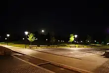 Athletic facilities at the park include several fields and courts.[1] Courts include one full-sized basketball court, a half-sized basketball court, two tennis courts, and a beach volleyball court.[1] The fields include one baseball field, four softball fields, and three soccer fields that overlay the softball diamonds' outfields.[1] Memorial Park also includes the only skatepark in the city.[1]