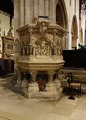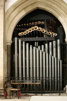 The organ was originally built in 1664 by Robert Hayward, of Bath. There are a number of ranks of pipes, still functioning in the present instrument, which date from this time. Originally, the organ stood upon a screen which separated the nave from the choir. However, in 1856 the organist at that time (Mr. F. Blount) removed the instrument and resited it in the south choir aisle. J. W. Walker & Sons rebuilt and enlarged the organ in 1866 and carried out further work in 1899, when a new case to house the Choir Organ was provided. This was designed by Walter J. Fletcher. In 1965, a major rebuilding and re-designing of the instrument took place, the work again being undertaken by J. W. Walker & Sons. The organ started being rebuilt by Mander Organ Builders in 2021 with a possible completion date of early 2022.[6] The project will see the instrument reorganised, with two new cases, a revised winding system and a new 32' pedal Sub Bass.