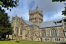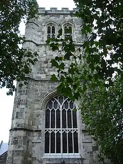 Since 1911 the west tower at the minster has been home to a ring of ten bells.[4] The original tenor bell was housed in the central tower and was cast in 1385. The central tower was considered too structurally weak to add much more additional weight, so in 1464 the west tower was constructed in order to house five bells.[4] In 1629 the tenor bell was recast. Besides the tenor, the minster at this time was home to the 'Bell of St. Cuthburga', 'The Fyfer Bell', 'The Jesus Bell' and 'The Morrow Mass Bell'; presumably all housed in the west tower.[4] In 2012, the bells were augmented to 12 by Whitechapel Bell Foundry, with an additional semitone bell cast to make a total of 13 bells.[5]