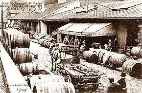 On August 9, 1905, parliament passed a law which required large wine merchants in Paris to have a storefront at the Bercy warehouse and its wine market.[8] Until the beginning of the 20th century, the two Parisian warehouses (the other being the Saint-Bernard market on the left bank) were of about equal importance. But the specialization of the Saint-Bernard market in fine wines and alcohol and the expansion of Bercy in 1910 gave the advantage to the latter. In 1930, Bercy represented 70% of storage and exits compared to 30% for the Saint-Bernard market.[7]