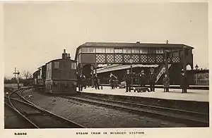 A new brick engine shed was also provided, with a 42 ft turntable, on a goods spur; initially it had only a single road to accommodate a trio of engines, but a second was added in 1893 to handle the station's growing traffic in perishables. This went out of use in the 1910s, with only the turntable remaining by 1925 when the London and North Eastern Railway had taken over responsibility for the line. Activities at Wisbech was by that time principally concerned with the tramway.[9] Tramway services departed from a specially-low platform at Wisbech.[10]