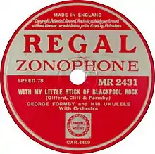 "With My Little Stick of Blackpool Rock" is a popular song by English entertainer George Formby, who recorded it in 1937. It was written by his regular songwriting team of Harry Gifford and Fred E. Cliffe, with input from Formby himself.