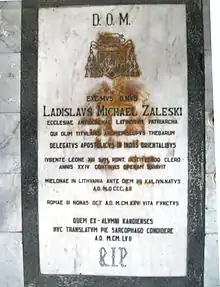 Zaleski's mission ended in 1916, after almost thirty years of residence in Asia. After returning to Rome he was nominated as the Patriarch of Antioch by Pope Benedict XV. Pope Benedict considered in 1919 his candidacy for the nomination of Cardinal, but eventually in the consistory that year other Polish bishops received the scarlet – Edmund Dalbor and Alexander Kakowski. Zaleski was in Rome for the rest of his life, where he died on 5 October 1925. He expressed the wish that his remains come to rest among those for whom he had laboured. With the transfer of the Papal Seminary, which he founded, from Kandy to its new location in Pune, in India, the Alumni of the same Seminary, some of whom had known Zaleski, fulfilled his wish, when his remains were transferred in 1955. Mgr. Zaleski's remains now rest in the Seminary at the floor of the altar in the new Chapel.[8] After his death, he was honored by naming one of Colombo's areas as 'Zaleski Place' (in 1937).[9] Throughout his life, Zaleski kept in touch with the home country, often emphasizing his attachment to Poland.