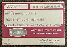 A membership card from 1981-1982 for the Woman’s International Bowling Congress
