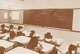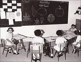 In 1955, Queen (Princess at the time) Effat, King Faisal's Wife, of Saudi Arabia established "Dar Al Hanan", the first school for girls in the country. In 1959, King Saud addressed the nation, started a public Girl Education program.[9] In 1960, "Kuliyat Al Banat" (The girl college) was launched, which was the first girl form of higher education in Saudi Arabia.[10] By 1961 there were 12 elementary schools for girls and by 1965 there were 160. By 1970, there 357 and by 1975 there were 963,[11] and 1980 there were 1,810.[11] By 1981, the number of girls enrolled in public schools almost equaled the number of boys.[11]