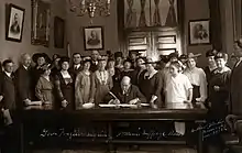 In the 1910s, more women's suffrage work emerged in the state. On February 4, 1912, suffragists were invited to meet Sylvia Pankhurst at the home of Mary Darrow Weible in Fargo.[12] Pankhurst gave a speech in the Grand Theatre where there was so much interest, that there was standing room only.[13] She also encouraged suffragists in North Dakota to form suffrage groups.[13] In June 1912, activists created a statewide Votes for Women League.[12] Helen deLendrecie donated the space for their headquarters in the deLendrecie Building where they remained from 1912 and 1918.[14] The first president was Weible and the organization was meant to affiliate with the National American Woman Suffrage Association (NAWSA).[15] The first convention of the Votes for Women League took place in the Civic Center in Fargo on October 18, 1913.[16] The organization came up with a plan to divide the state into judicial districts with activists representing the suffrage work in each district.[16] This plan was carried out partially and around 100 leagues were formed with a total of around 2,000 members.[16]