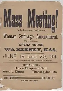 The former territorial governor, John Evans, promoted women's suffrage in the territorial legislature in 1868.[41] Women's suffrage was proposed again in the legislature by Governor Edward M. McCook in 1870.[41] A women's suffrage group, the Territorial Woman Suffrage Society was formed in 1876 and went on to address the state constitutional convention.[42] While women did not get equal suffrage from the new constitution, they were granted the right to vote in school board elections.[43] A full suffrage referendum was passed and would be voted on October 2, 1877.[44][45] Despite the efforts of suffragists from around the country, the referendum was defeated.[45] Activists continued to fight for equal suffrage, forming new groups,[46] lobbying the legislature,[47] writing about suffrage,[44][48] and urging women to exercise their right to vote in school elections.[49]