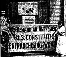 Prospects for a national amendment looked dim at the turn of the century, and progress at the state level had slowed.[4] In the 1910s, however, the drive for a national amendment was revitalized, and the movement achieved a series of successes at the state level. The newly formed National Woman's Party (NWP), a militant organization led by Alice Paul, focused almost exclusively on the national amendment. The larger NAWSA, under the leadership of Carrie Chapman Catt, also made the suffrage amendment its top priority.[5] In September 1918, President Wilson spoke before the Senate, asking for the suffrage amendment to be approved. The amendment was approved by Congress in 1919 and by the required number of states a year later.[6]