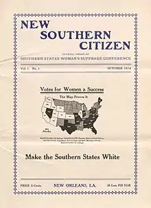 Southern suffragists are often left out of mainstream histories of the movement. Their work was imbued with the cultural assumptions of their day.[264] Many suffragists in the South—both white and black—were predominantly clubwomen, highly educated, and often from more elite families. Black women suffragists worked within their local clubs and later with the National Association of Colored Women's Clubs; some also became individual members of a suffrage association when their clubs were denied membership. Many black women educators, active in their teacher associations, would also speak out for voting rights, either for their men who were granted voting rights with the 15th Amendment and sometimes specifying voting rights for black women.[265] White middle-class women of the South who fought for voting rights were skilled in organizational efforts utilized in memorializing the Lost Cause[266] through a Ladies' Memorial Association or the United Daughters of the Confederacy.[267] In 1906 twelve delegates from states throughout the South came together in Memphis to form the Southern Woman Suffrage Conference. Laura Clay was elected president. This group broke from the NAWSA, which had turned away from its "Southern Strategy" efforts and worked instead to win suffrage at the state and local levels rather than with a federal amendment to the U.S. Constitution.