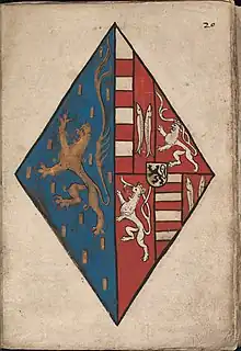 Archduke Charles (later Holy Roman Emperor Charles V), aged 2, with his sisters Eleonore and Isabella. Charles's arms are depicted on a shield with a label indicating that he is his father's heir while those of his sisters are on lozenges with half left blank, to be filed with those of their future husbands.