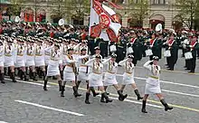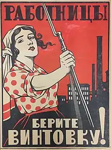 Others included Maria Bochkareva, who was decorated three times and promoted to senior NCO rank, while The New York Times reported that a group of twelve schoolgirls from Moscow had enlisted together disguised as young men.[10] In 1917, the Provisional Government raised a number of "Women's Battalions", with Maria Bochkareva given an officer's commission in command. They were disbanded before the end of the year. In the later Russian Civil War, they fought both for the Bolsheviks (infantry) and the White Guard.[11]