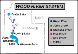 The Wood River watershed drains 220 square miles (570 km2) forest land in the Cascade Mountains southeast of Crater Lake and the Wood River Valley. The drainage around its headwaters is forest county dominated by ponderosa pine and lodgepole pine with some quaking aspen in meadow lands. Annie Creek drains steep alpine forest country. From near its headwaters to the border of Crater Lake National Park, the creek has cut a deep canyon through the forest that is a well known feature within the park. After leaving the park, Annie Creek flows into flat meadow lands on the western border of Sun Pass State Forest. Annie Creek also feeds several irrigation canals including Scott Ditch, Shattuck Ditch, Loosely-Streeter-Cardwell Ditch, and Copeland Lateral Ditch. Excess flow from these canals is returned to Annie Creek and the Wood River. The lower Wood River flows through pasture land and ultimately opens into a large marsh before draining into Agency Lake.[1][3][4]