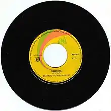 In November 1970, "Woodstock" by Matthews Southern Comfort had its US single release on the group's regular US label, Decca Records, another MCA affiliate. Initially the single's US release had only marginal impact, spending six weeks on the 101–150 singles chart in Record World in December 1970 – January 1971 and then dropping off having peaked at #110.[15] However upon "Woodstock's" January 1971 single release in Canada – where a 30% Canadian Content radio airplay quota was being phased in – the track received airplay at least partially because of its Canadian authorship,[16] and assisted by airplay on Canadian radio stations with US listeners – notably CKLW, the Windsor ON station credited with the track's Canadian "breakout"[17]- "Woodstock" accrued newfound US interest, debuting on the Billboard Hot 100 dated 6 March 1971 at #83 to rise to a #23 Hot 100 that May. In Canada "Woodstock" reached a #5 peak on the RPM 100 singles chart.[18]