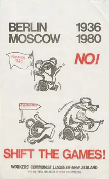 Poster of the Workers' Communist League of New Zealand, protesting against the 1980 Moscow Olympics. The poster carries the header "Berlin 1936 Moscow 1980" (alluding to the 1936 Berlin Olympics) and shows the Moscow Olympics mascot Misha as a Matryoshka doll.