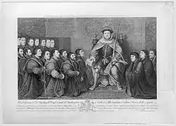 The first Master of the Company of Barbers and Surgeons was the superintendent of St Bartholomew's Hospital and royal physician, Thomas Vicary. The presentation of the charter is the subject of a painting by Hans Holbein the Younger, in the collection of the Barbers' Company.[3]