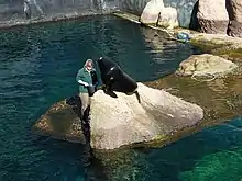The zoo enjoyed considerable popularity among the inhabitants of Breslau despite a relatively limited variety of animals to be seen. The first elephant was bought in as late as 1873. It was an African elephant named Theodor and was transported from the London Zoo. It instantly became one of the biggest attractions of the zoo in Breslau.[7][9] In later years, the garden also acquired such animals as an anteater, eared seals, and penguins. Among other favourite animals of the zoo were chimpanzee Moritz and gorilla Pussy which arrived in the city in 1897 from Liverpool. A commemorative statue devoted to her can still be found to this day in the Wrocław Zoo.[8]