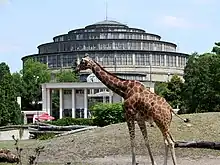 A giraffe at the Wrocław Zoo and the Centennial Hall in the background