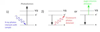 The fundamental phenomenon underlying XANES is the absorption of an x-ray photon by condensed matter with the formation of many body excited states characterized by a core hole in a selected atomic core level (refer to the first Figure). In the single-particle theory approximation, the system is separated into one electron in the core levels of the selected atomic species of the system and N-1 passive electrons. In this approximation the final state is described by a core hole in the atomic core level and an excited photoelectron. The final state has a very short life time because of the short life-time of the core hole and the short mean free path of the excited photoelectron with kinetic energy in the range around 20-50 eV. The core hole is filled either via an Auger process or by capture of an electron from another shell followed by emission of a fluorescent photon. The difference between NEXAFS and traditional photoemission experiments is that in photoemission, the initial photoelectron itself is measured, while in NEXAFS the fluorescent photon or Auger electron or an inelastically scattered photoelectron may also be measured. The distinction sounds trivial but is actually significant: in photoemission the final state of the emitted electron captured in the detector must be an extended, free-electron state. By contrast, in NEXAFS the final state of the photoelectron may be a bound state such as an exciton since the photoelectron itself need not be detected. The effect of measuring fluorescent photons, Auger electrons, and directly emitted electrons is to sum over all possible final states of the photoelectrons, meaning that what NEXAFS measures is the total joint density of states of the initial core level with all final states, consistent with conservation rules. The distinction is critical because in spectroscopy final states are more susceptible to many-body effects than initial states, meaning that NEXAFS spectra are more easily calculable than photoemission spectra. Due to the summation over final states, various sum rules are helpful in the interpretation of NEXAFS spectra. When the x-ray photon energy resonantly connects a core level with a narrow final state in a solid, such as an exciton, readily identifiable characteristic peaks will appear in the spectrum. These narrow characteristic spectral peaks give the NEXAFS technique a lot of its analytical power as illustrated by the B 1s π* exciton shown in the second Figure.