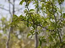 Ximenia americana is a semiscandent plant that grows as a bush-forming shrub or small tree to between a height of 2–7 metres (6.6–23.0 ft),[9][8] although plants being less than 4m (13 feet) are more commonly observed.[7] The trunk has a diameter of less than 10 cm (4 in); the bark has a colour of dark brown to pale gray.[9] The branches form an arch downwards[7] and the branchlets have straight, thin spines that are 1 cm long, protruding out of it, and are coloured purple-red with a waxy bloom.[9][10]