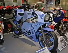 Designed for competition in the AMA Superbike Championship Daytona 200, this machine was based on the FZ750 production model. With the transfer of the AMA Daytona 200 title from the Formula 1 class to the Superbike class in 1985, this machine recorded its 14th win ridden by Eddie Lawson in the 1986 Daytona 200. The bike contained many exotic parts such as a cable operated clutch, performance camshafts, dry clutch and oil cooler. Many of these parts found their way into the sought after factory race kit and onto the later FZR750/1000. Maximum power was somewhere in the region 95.6kW (130PS).[8]