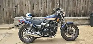 The YX600 Radian is a sport/touring motorcycle manufactured by the Yamaha Motor Company between the years of 1986–1990. Except for the suspension, the rest of the Radian was a parts-bin motorcycle and came equipped with a slightly detuned for mid and low-end torque version of air-cooled, inline-4 which came from the Yamaha XJ600 that was also along with the Radian used in the Yamaha FZ-600 Sport Motorcycle (precursor of Yamaha's FZR series of performance bikes), as well as smaller carburetors and frame from the 550 Maxim.[1][2] Cycle World obtained for the Radian a 1/4 mi. time of 12.76 @ 103.8 mph (167.0 km/h) and 0 to 60 mph (0 to 97 km/h) acceleration at 3.8 seconds.