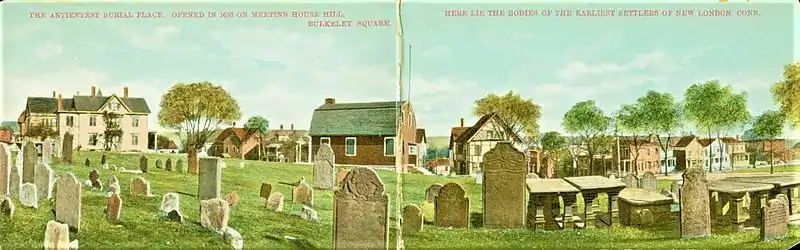 Ye Antientist Burial Ground is a cemetery in New London, Connecticut, bounded by Hempstead Street on the west and Huntington Street on the east, running from Granite Street to approximately Bristol Street. It has been known by several names over the years, many spelling variations on Ancient Burial Ground. It is one of the earliest graveyards in New England and the oldest colonial cemetery in New London County. The hillside lot of 1.5 acres (6,000 m2) and adjoins the site of New London's first meeting house. The settlement at the time was called "Pequot Plantation" until the name changed in 1658. From the burial grounds, the visitor has a broad view to the east of the Thames River and, on the far shore, the heights of Groton, Connecticut.