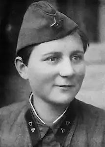 Shortly after starting another semester in September 1941, she left school for the army in November 1941. Initially she attended local radio operator courses, which she graduated from in January 1942 before being deployed to the warfront; the classes normally lasted over a year, but due to the war they were condensed to an intense several months of study. Nevertheless, she excelled as a radio operator, and was made a section leader in her class. Upon deployment on the Southern front she initially took part in the battle for Volchansk before reaching the city of Kharkhov in May 1942. Throughout the war she participated in the battles for Volchansk, Kharkhov, as well as the Voronezh-Voroshilovgrad operation. Having initially been assigned as a radio operator for a tank unit to help them communicate with infantry, she found herself wanting to get closer to the frontlines, and was eventually assigned to the 2nd battalion of the 216th Infantry Regiment. In addition to serving in her capacity as a radio operator, she practiced firing machine guns; in one of her letters home she wrote that she was happy for have found her place in the military. On 30 June the Wehrmacht launched an offensive that cut off the battalion command post she was stationed at from the rest of her regiment. Not giving up, she worked to transmit communications to regimental command as long as she could; after enemy soldiers broke into her post she shot several enemy soldiers in attempt to fight them off, but was eventually captured and tortured for information; despite being mutilated and both her hands being cut off, she refused to reveal the codes used. Unable to get her to reveal any information after brutal torture, the Nazis shot her. Her remains were later found by the Red Army, which buried her in a mass grave in Zimovenka village. On 27 September 1942 she was posthumously nominated for the Order of Lenin, but the award was downgraded to the Order of the Red Banner. Later on in the war a leaflet describing her feat was distributed in 1943, and eventually there were calls for her to be awarded the title Hero of the Soviet Union. Shortly after the end of the war, she was nominated for the title, a decision supported by a general who heard about her death after seeing combat in the same battle as her, and eventually she was awarded the title on 15 May 1946.[4][5][6][lower-alpha 2]