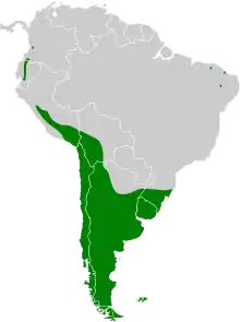 The range includes much of South America, the Falkland Islands, and South Georgia. The nominate and smallest subspecies, the South Georgia pintail A. g. georgica, is thought to number between 1000 and 1500 pairs and is found only in South Georgia. The Chilean, or brown, pintail A. g. spinicauda is widespread on the South American mainland from extreme southern Colombia southwards, as well as in the Falkland Islands, and numbers well over 110,000. Niceforo's pintail A. g. niceforoi, formerly found in central Colombia, is believed to be extinct, having been last recorded in 1952 (and described only in 1946). Their habitat ranges from high-elevation lakes and marshes to low-elevation lakes and rivers and coasts in open country.[11]