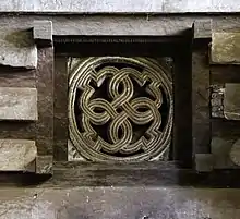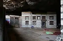 The construction of the church is credited to Yemrehana Krestos. The building is notable for its resemblance to the ancient church on Debre Damo, with walls that, according to Phillipson, "show a similar horizontal pattern of inset beams and projecting stonework", with "wooden quoins, door- and window-frames [that] are essentially Aksumite in style".[1] Stuart Munro-Hay believes that the church's interior decorations make "Yimrehana Krestos the most elaborate of all known ancient Ethiopian churches."[2] Mural paintings high on the nave walls are considered the oldest surviving mural paintings in Ethiopia.[3] The cave also contains a second structure north of the church, which tradition describes as a palace or residence of Negus Yemrehana Krestos, but now serves as a residence and storage space for the local priests.[4]