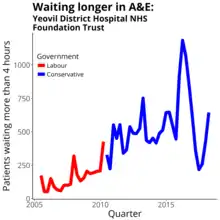 Yeovil District Hospital NHS Foundation Trust was a NHS trust that previously ran Yeovil District Hospital in Yeovil, Somerset, England. It provided acute care for a population of about 180,000, people living in South Somerset, North and West Dorset, and parts of Mendip. The hospital admits around 30,000 inpatients or day cases each year and treats more than 90,000 people in the outpatient appointments. Approximately 40,000 people are treated in Accident and Emergency and 1,300 babies are born in the maternity unit each year.[1]