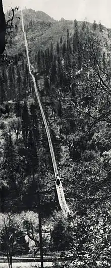 The Yosemite Lumber Company constructed a railroad incline to access their timber holdings on a high tableland opposite El Portal. The incline, which was the steepest ever built, connected the timberlands high on the tableland with the Yosemite Valley Railroad located in the Merced River valley below.[4]: 125–126