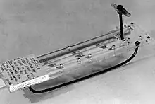 Yosemite Lumber Company carpenter Louie Farr built a six-foot-long sled for riding down the southside incline above El Portal. The left edge of the sled had two cleats that straddled one rail, fastened to their underside. The right edge had a curved metal bar on the bottom that rode on top of the ties at rail height, keeping the sled level. Ties that were slightly higher than normal were trimmed to accommodate the bar. Pulling back on the front handle tightened the cleats against the rail, providing a friction brake. Many loggers rode the sled down the steep 8,100 feet (2,500 m) slope over the years, with the record from top to bottom being two and a half minutes, exceeding 35 miles per hour (56 km/h). However, many loggers were injured when the sled jumped the track at high speeds, leading to its discontinuation.[2]: 66