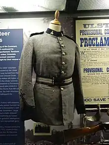 The Ulster Volunteers were most closely associated with the 36th (Ulster) Division during the First World War and the YCV as a unit formed the 14th Battalion of the Royal Irish Rifles, which was part of the 36th.[14] The Battalion was commanded by Lieutenant Colonel Robert Chichester, who addressed the soldiers as "young citizens", and wore the grey uniform of the YCV, although the group's 750 members were augmented by troops from mainland Britain (who made up 25% of the 14th) and the rest of Ireland (17%).[15] A large group of English conscripts in the Battalion were nicknamed the "Gawd Blimey Brigade" by the original Belfast members, many of whom came from middle and upper-class families and looked down on the more rough and ready English soldiers.[16] The more well off origins of the YCV members saw the Battalion itself acquire the nickname "Young Chocolate Soldiers".[17]