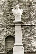 A marble bust of Demetrius Ypsilanti stands between a Greek and a U.S. flag at the base of the water tower. The city of Ypsilanti is named after this hero of Greek independence.