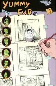 Yummy Fur started as a self-published minicomic which ran for seven issues, the contents of which were reprinted in the first three issues of the Vortex Comics series which started publication in December 1986. The series switched publishers to Drawn & Quarterly in 1991 until the end of its run in 1994, when Brown started on his Underwater series.
