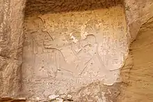 • Rock stela at al-Kanāʾis (el-Kanaïs) The Viceroy Yuny is kneeling before Pharaoh Seti I, who is seating on a throne.[4]