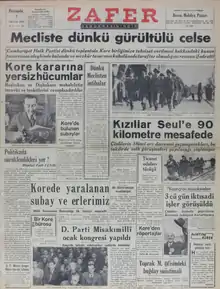 Zafer (Turkish: Victory) was a daily newspaper which was published in Ankara, Turkey, between 1949 and 1960. It was one of the leading newspapers in Turkey during the 1950s.[1] It is known for its close affiliation with the Democrat Party (DP) which was the ruling party in the period 1950–1960.[2] The paper was closed by the Turkish authorities immediately after the military coup on 27 May 1960 which ended the rule of the DP.[3]