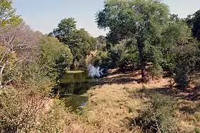 Zambezi National Park is a national park located upstream from Victoria Falls on the Zambezi River. It was split off from Victoria Falls National Park in 1979 and is 56,000 hectares (140,000 acres) in size. The park is bisected by a road to Kazungula, dividing it into a riverine side and a Chamabonda Vlei side. Most of the park is within the ecoregion of Zambezian and Mopane woodlands, while a small portion in the south is within the Zambezian Baikiaea woodlands.[1][2]