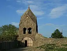 In the northwest corner of the complex stands a 16th–17th-century two-storey bell-tower, measuring 5.45 × 5.35 m., with its façades faced with grey hewn stone slabs. The ground floor acts as a vaulted porch with three bearing arches; the top storey a pyramidal structure containing bells. Façades contain several now barely legible asomtavruli inscriptions. The base between openings is a round pillar adorned with a capital. Each of the four façades of the bell-tower terminates in a gable, the peak of which is topped with a sculpted head of a ram. The bell-tower is flanked on either side by a stone wall, which is a later addition.[10][3]