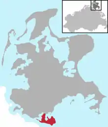 The peninsula lies between the bay of Schoritzer Wiek, the lagoon of Rügischer Bodden (the northern part of the Greifswalder Bodden) and the southwestern entrance to the Strelasund.