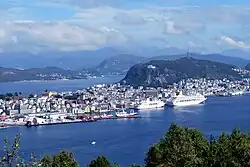 - 🌍 Mt Aksla and Fjellstua (Walk, taxi or sightseeing bus/tram). From the city park (from the pedestrian shopping street Kongensgata, follow Lihauggata past the Rollon statue to the Byparken) walk up the stairs cut into the cliff to Fjellstua for a breathtaking view of local fjords and mountains. This can really not be underlined enough. Even if you are not up to climbing all 418 steps, even half way up the view is stunning. Alternatively, you can get a taxi or sightseeing tram to drive you up there for the view from the top. This is a must-see. At the top of the mountain there are walkways that allow you to walk around in natural surroundings while enjoying the view of the islands and mountains around you. There is also a restaurant at Fjellstua serving basic dishes.