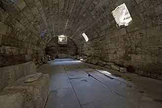 Hammam is the local name given to the set of baths on the left as you start up the lane, larger and earlier in date than the other set. They were probably built at the same time as the stadium, say from 160 AD, and include a palaestra, a wrestling school.