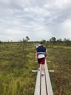 - 🌍 The Great Ķemeri Moorland (inside Ķemeri National Park) (Lielais Ķemeru tīrelis), Slampes pagasts (there are frequent train connections towards Tukums with a stop in Ķemeri village, right in the middle of the Moorland; also, the major "highway" going east towards Tukums and Ventspils goes right through the Moorland), ☏ +371 67730078, pieriga@daba.gov.lv. Head south, and you will find a trail made of planks across the swamp including an 🌍 observation tower (but without a roof, so not good for overnighting without a tent)—see included track in the following. It seems that (from the satellite view) starting from the observation tower (popular with photographers for sunrise and sunset scenes), there is a trail leading even further south into the swamp, probably requiring rubber boots – check out the trail, also included with this listing. Nevertheless, also northwest of Ķemeri village trails lead through the swamp, check them out on OpenStreetMap, which many mobile Apps like OsmAnd or Mapy.cz, etc. use, or any other preferred map.