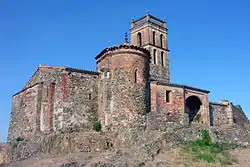 The Mezquita is a fortified mosque on the hill top with an adjacent old bullring. The Mezquita was built in the 10th century from a visigothic basilica from the 5th century, reusing its materials. It is one of the few surviving Spanish rural mosques. It is an oddly-shaped building, made of brick and stone in a trapezoid shape, probably because of the hilly terrain.
