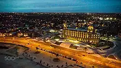 Northeast along Rambla Armenia, the tall palms have been replaced by lower ones and they are no longer placed evenly along the road. The houses are taller, further from the street and with more space between them. At one point you can look left to catch a glimpse of Montevideo's three 🌍 World Trade Center skyscrapers. The street makes a couple of turns, and changes name to Rambla República de Chile. Then it passes the 🌍 Zoological museum with its minaret-like tower to the right and the 🌍 Buceo cemetery to the left. And yet another beach with a faraway view; 🌍 Playa Buceo. The parallel road that goes up the bank connects to Bulevar José Batlle y Ordóñez, another of Montevideo's major thoroughfares.