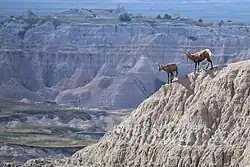 While the badlands terrain may appear to be barren, there is a great variety of wildlife and plant life here. The minimal annual precipitation feeds the grasses and wildflowers of the badlands. The brilliant colors of the blooms add to the palette of grays, browns, reds, ochres and greens of the land. The wildlife includes nearly two hundred species of birds, (mule and white tail) deer, prairie dogs, pronghorn, big horn sheep, and bison. Other mammals in the park include bats, rabbits, and coyotes. The park has reintroduced the black footed ferret, the most endangered land mammal in North America, to the Sage Creek Wilderness area. Reptiles and amphibians include frogs, toads, and snakes.